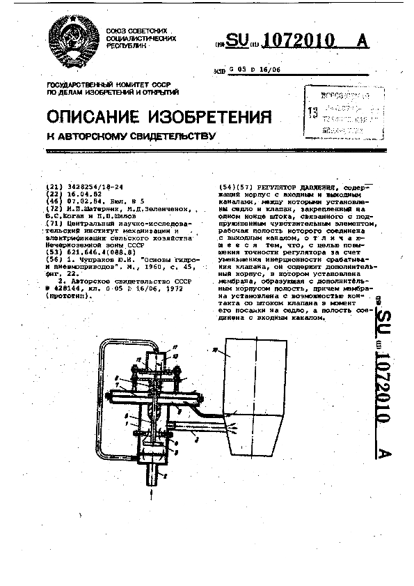 Регулятор давления / Шатерник М. П., Зеленченок М. Д., Коган В. С., Шилов П. В.; заявитель: Центральный научно-исследовательский институт механизации и электрификации сельского хозяйства Нечерноземной зоны СССР // Описания изобретений (ретрофонд) / Комитет по патентам и товарным знакам России. – М. — (Патенты России)., 2003. – 1984, № 1. — Загл. с титул. экрана. — Систем. требования: Acrobat Reader. — Режим доступа: ftp://smolensklib.ru/bd/patent_ru/pt1072010.pdf. — <URL:ftp://smolensklib.ru/bd/patent_ru/pt1072010.pdf>.