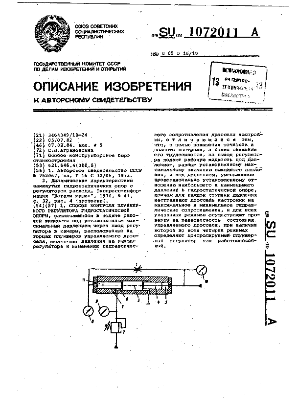 Способ контроля плунжерного регулятора гидростатической опоры / Аграновский С. Н.; заявитель: Особое конструкторское бюро станкостроения // Описания изобретений (ретрофонд) / Комитет по патентам и товарным знакам России. – М. — (Патенты России)., 2003. – 1984, № 1. — Загл. с титул. экрана. — Систем. требования: Acrobat Reader. — Режим доступа: ftp://smolensklib.ru/bd/patent_ru/pt1072011.pdf. — <URL:ftp://smolensklib.ru/bd/patent_ru/pt1072011.pdf>.