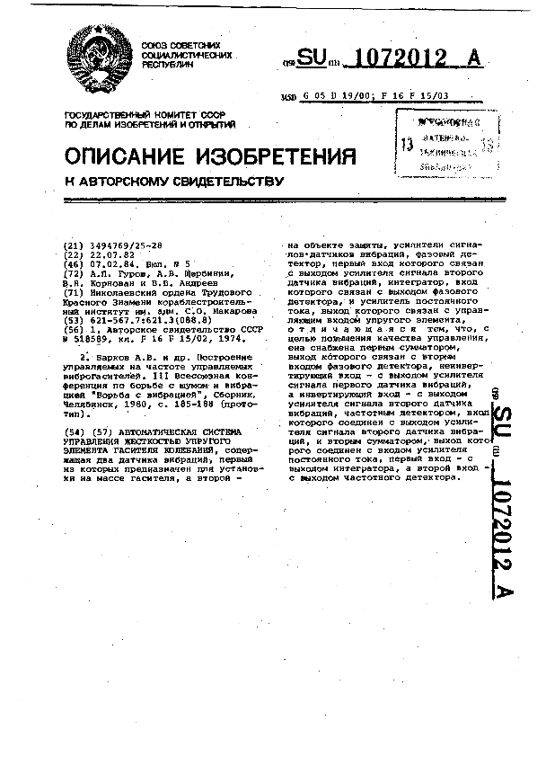 Автоматическая система управления жесткостью упругого элемента гасителя колебаний / Гуров А. П., Щербинин А. В., Корнован В. Н., Андреев В. В.; заявитель: Николаевский ордена Трудового Красного Знамени кораблестроительный институт им. С. О. Макарова // Описания изобретений (ретрофонд) / Комитет по патентам и товарным знакам России. – М. — (Патенты России)., 2003. – 1984, № 1. — Загл. с титул. экрана. — Систем. требования: Acrobat Reader. — Режим доступа: ftp://smolensklib.ru/bd/patent_ru/pt1072012.pdf. — <URL:ftp://smolensklib.ru/bd/patent_ru/pt1072012.pdf>.