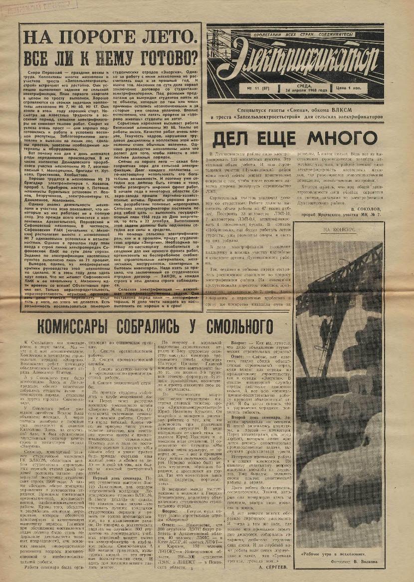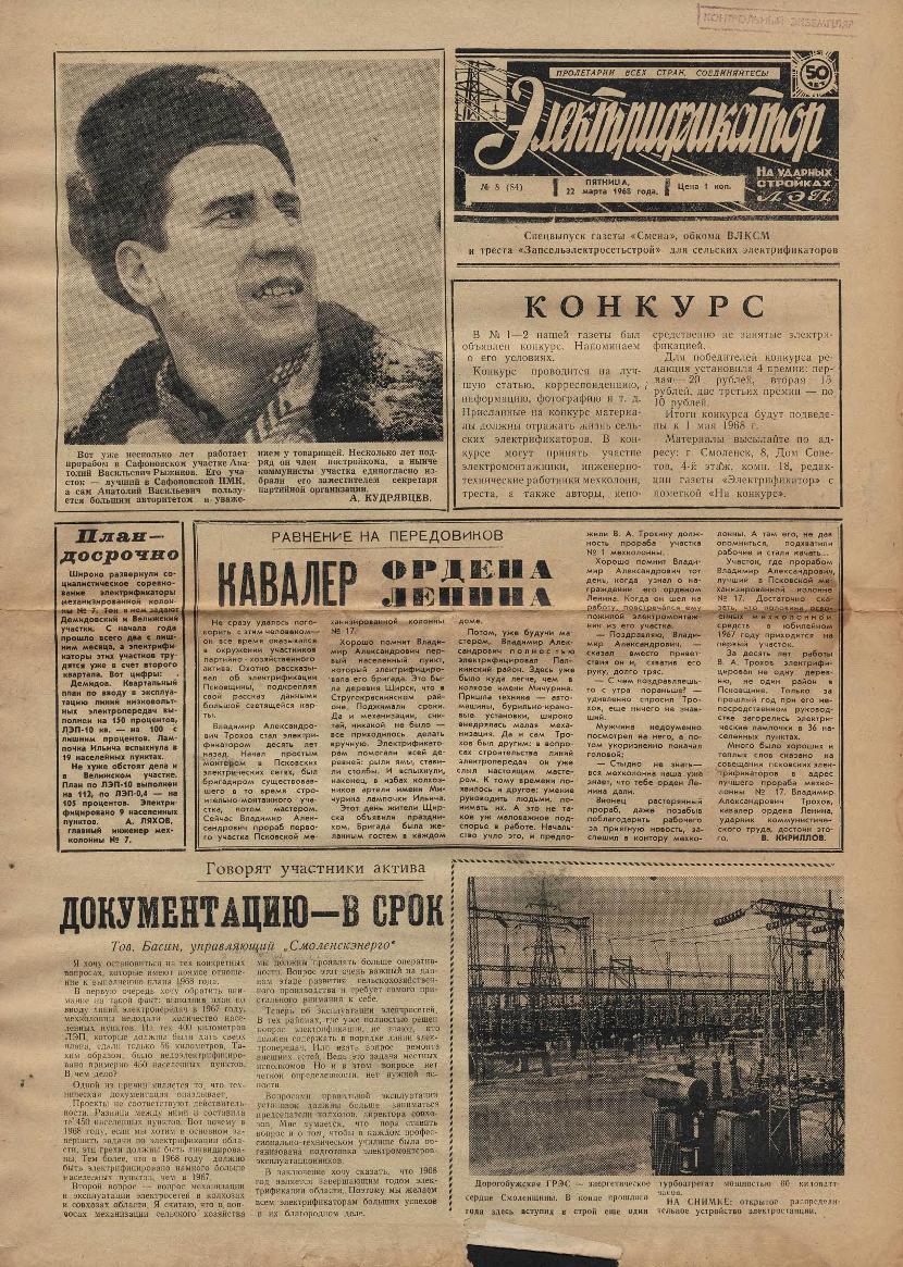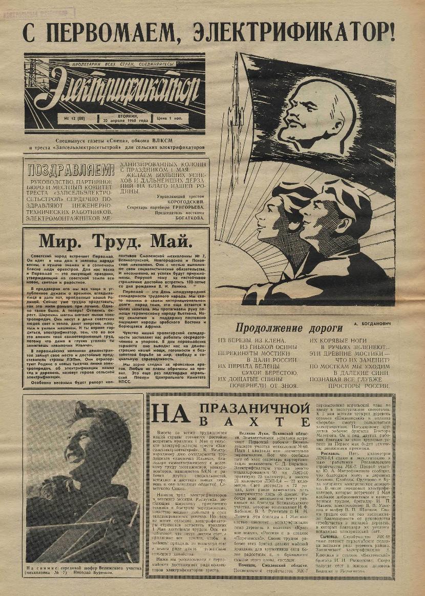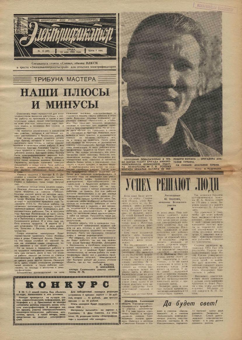 Электрификатор: Спецвыпуск газеты "Смена" - и треста "Запсельэлектросетьстрой" для сельских электрификаторов. — Смоленск: Тип. им. Смирнова, 1965-____. № 13.