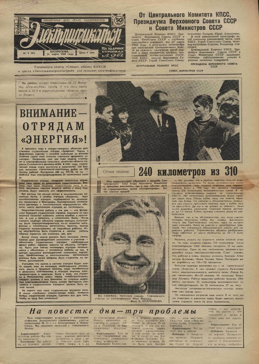 Электрификатор: Спецвыпуск газеты "Смена" - и треста "Запсельэлектросетьстрой" для сельских электрификаторов. — Смоленск: Тип. им. Смирнова, 1965-____. № 9.