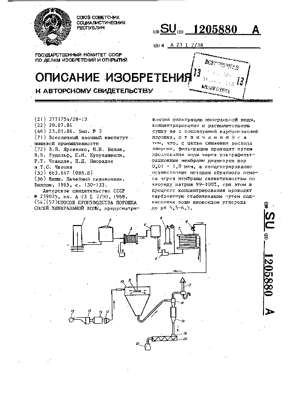 Способ производства порошка солей минеральной воды / Яровенко В. Л., Белов Н. И., Рудольф В. В. [и др.]; заявитель: Всесоюзный заочный институт пищевой промышленности // Описания изобретений (ретрофонд) / Комитет по патентам и товарным знакам России. – М., 2003. – 1986, № 1. — (Патенты России). — Загл. с титул. экрана. — Поисковая система: ИПС MIMOSA GTI. — Систем. требования: Acrobat Reader. — Режим доступа: ftp://smolensklib.ru/bd/patent_ru/pt1205880.pdf. — <URL:ftp://smolensklib.ru/bd/patent_ru/pt1205880.pdf>.