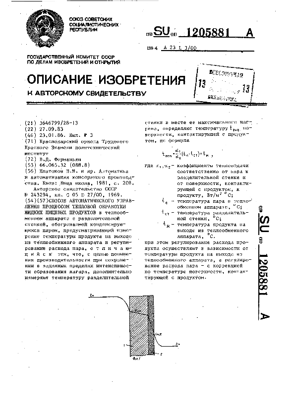 Способ автоматического управления процессом тепловой обработки жидких пищевых продуктов / Ферманьян В. Д.; заявитель: Краснодарский ордена Трудового Красного Знамени политехнический институт // Описания изобретений (ретрофонд) / Комитет по патентам и товарным знакам России. – М., 2003. – 1986, № 1. — (Патенты России). — Загл. с титул. экрана. — Поисковая система: ИПС MIMOSA GTI. — Систем. требования: Acrobat Reader. — Режим доступа: ftp://smolensklib.ru/bd/patent_ru/pt1205881.pdf. — <URL:ftp://smolensklib.ru/bd/patent_ru/pt1205881.pdf>.