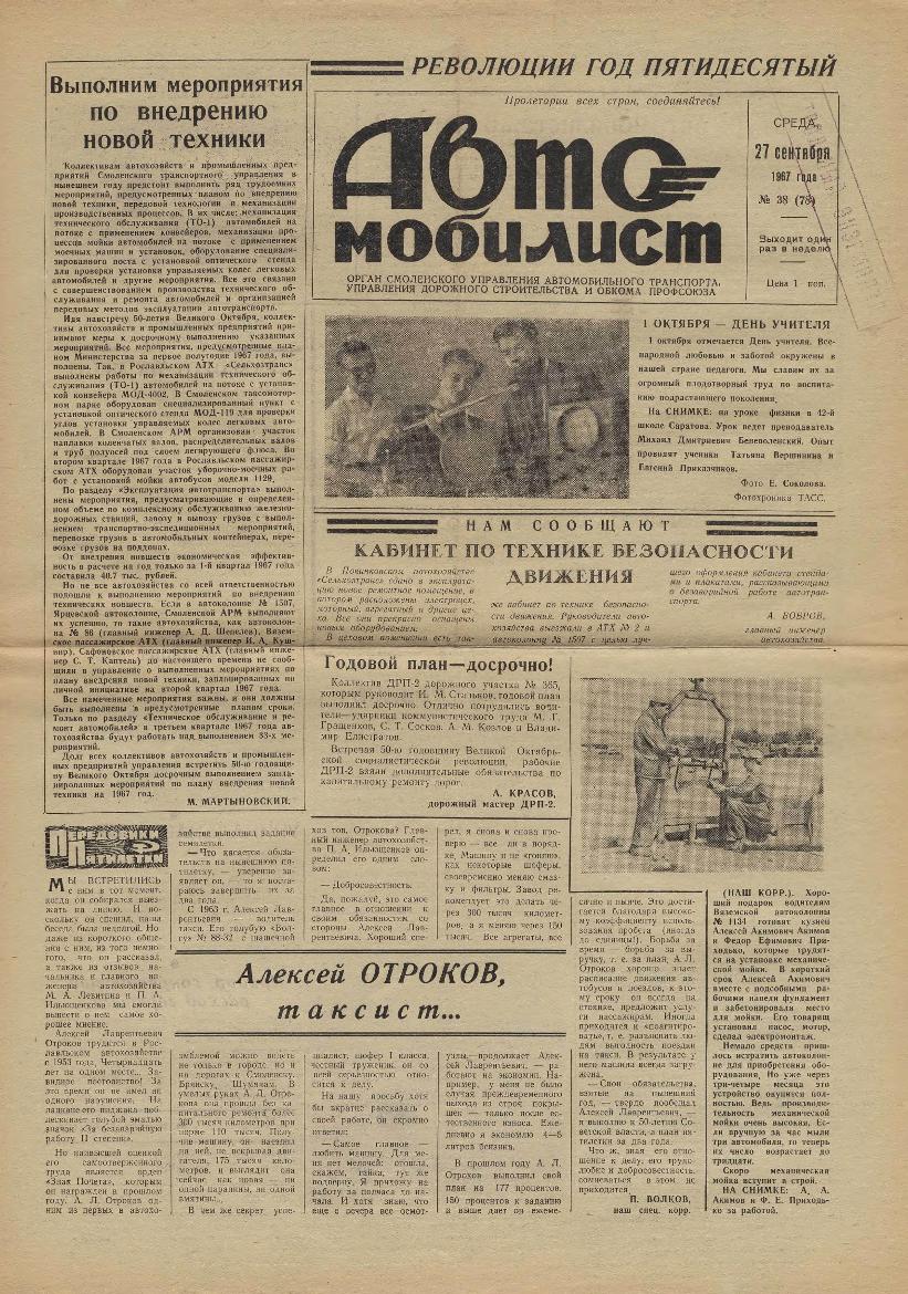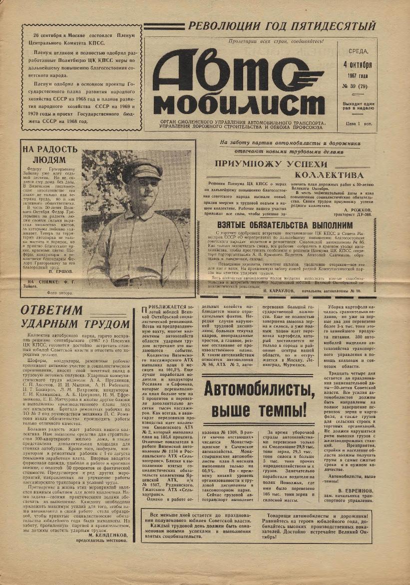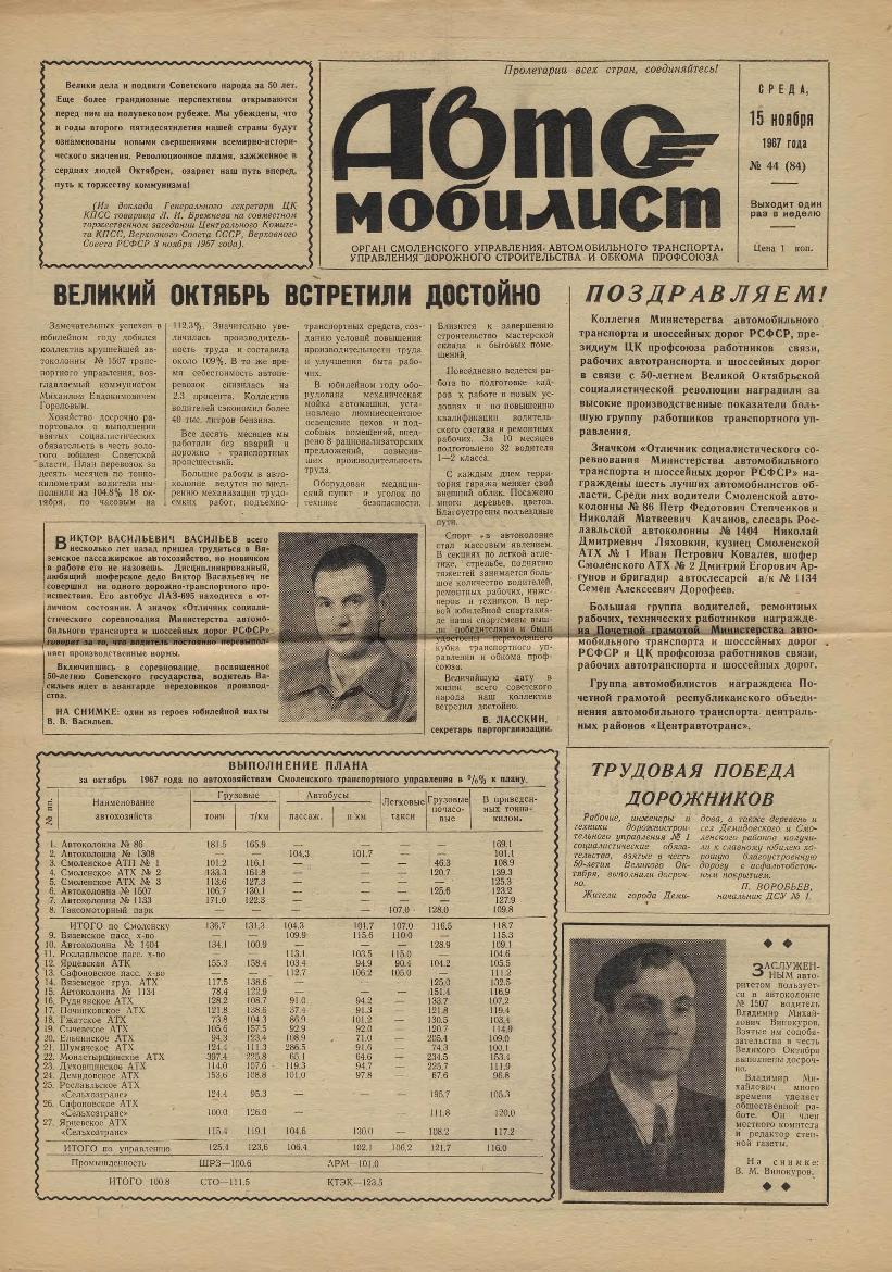 | 338 | Автомобилист: Орган Смоленского управления автомобильного транспорта, управления дорожного строительства и Обкома профсоюза. — Смоленск: Смолгортип., 1966-____. № 44.