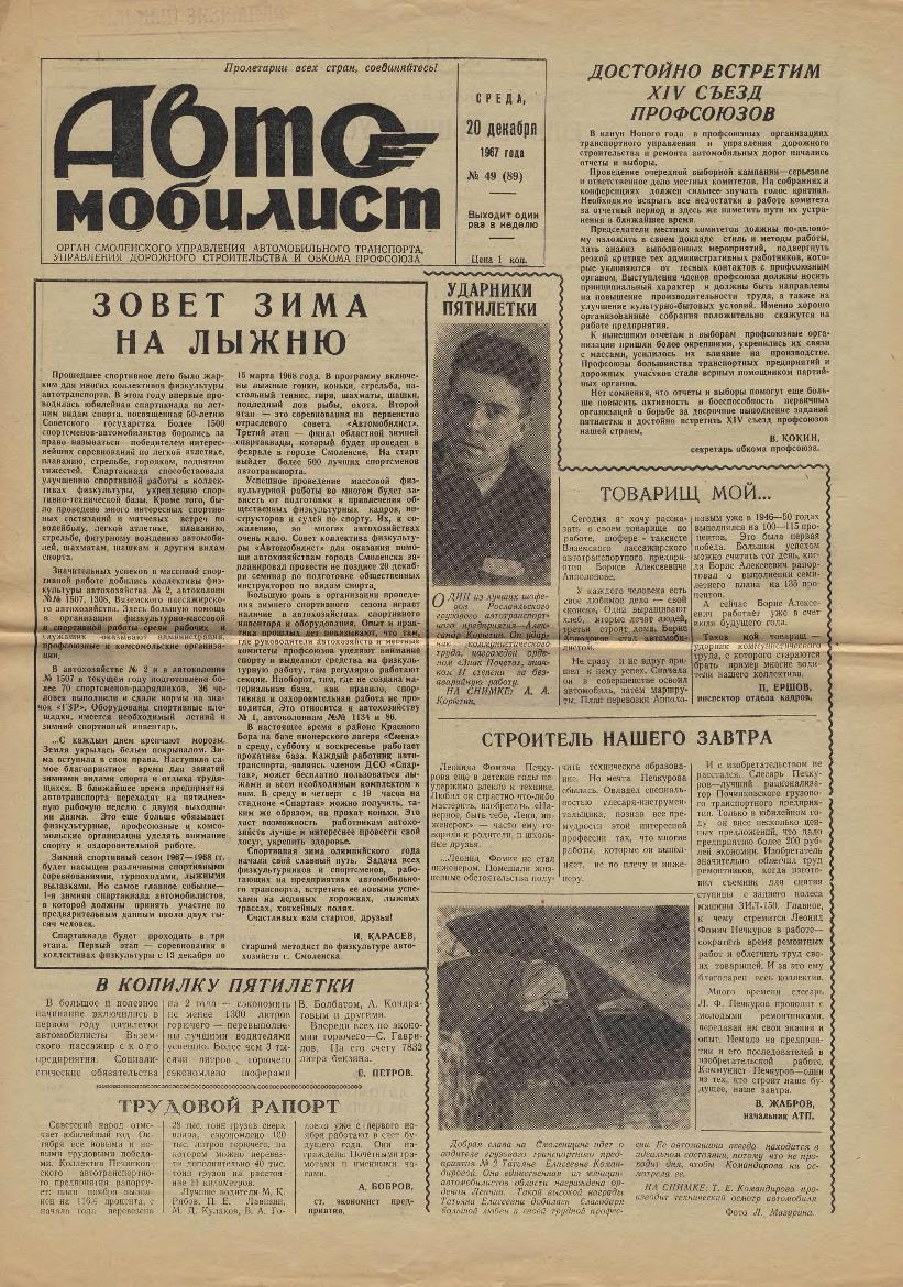 | 335 | Автомобилист: Орган Смоленского управления автомобильного транспорта, управления дорожного строительства и Обкома профсоюза. — Смоленск: Смолгортип., 1966-____. № 49.