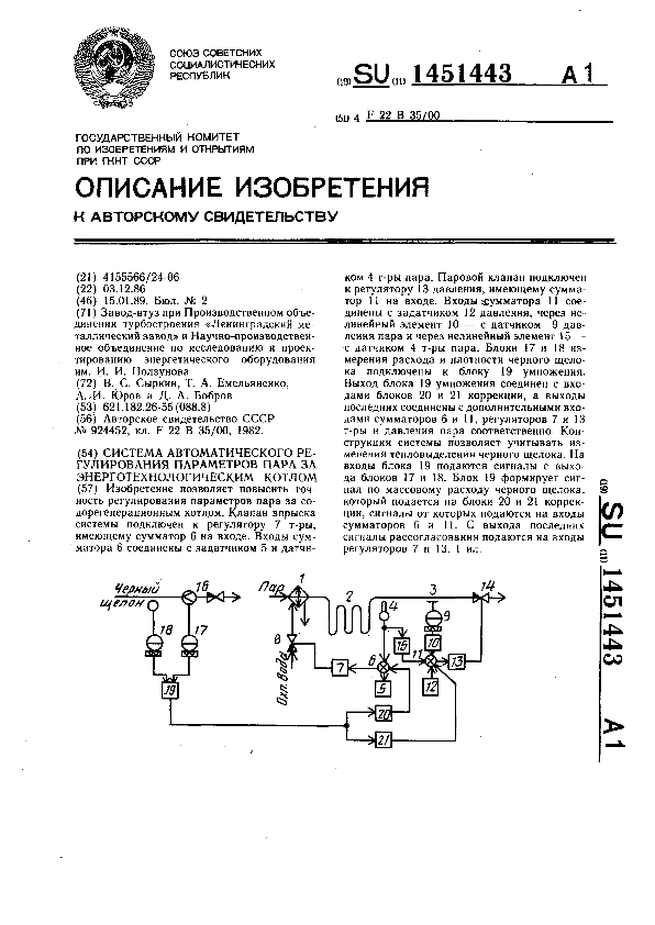 | 332 | Система автоматического регулирования параметров пара за энерготехнологическим котлом / Сыркин В. С., Емельяненко Т. А., Юров А. И., Бобров А. А.; заявитель: Завод-втуз при Производственном объединении турбостроения «Ленинградский металлический завод» и Научно-производственное объединение по исследованию и проектированию энергетического оборудования им. И. И. Ползунова // Описания изобретений (ретрофонд) / Комитет по патентам и товарным знакам России. – М., 2003. – 1989, № 1. — (Патенты России). — Загл. с титул. экрана. — Поисковая система: ИПС MIMOSA GTI. — Систем. требования: Acrobat Reader. — Режим доступа: ftp://smolensklib.ru/bd/patent_ru/pt1451443.pdf. — <URL:ftp://smolensklib.ru/bd/patent_ru/pt1451443.pdf>. | 10/21/2025 |