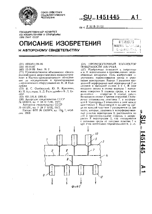 Промежуточный коллектор поверхности нагрева / Оробинский В. С., Красавин Ю. В., Кузнецов Ю. Н. [и др.]; заявитель: Производственное объединение «Белгородский завод энергетического машиностроения» и Научно-производственное объединение по исследованию и проектированию энергетического оборудования им. И. И. Ползунова // Описания изобретений (ретрофонд) / Комитет по патентам и товарным знакам России. – М., 2003. – 1989, № 1. — (Патенты России). — Загл. с титул. экрана. — Поисковая система: ИПС MIMOSA GTI. — Систем. требования: Acrobat Reader. — Режим доступа: ftp://smolensklib.ru/bd/patent_ru/pt1451445.pdf. — <URL:ftp://smolensklib.ru/bd/patent_ru/pt1451445.pdf>.