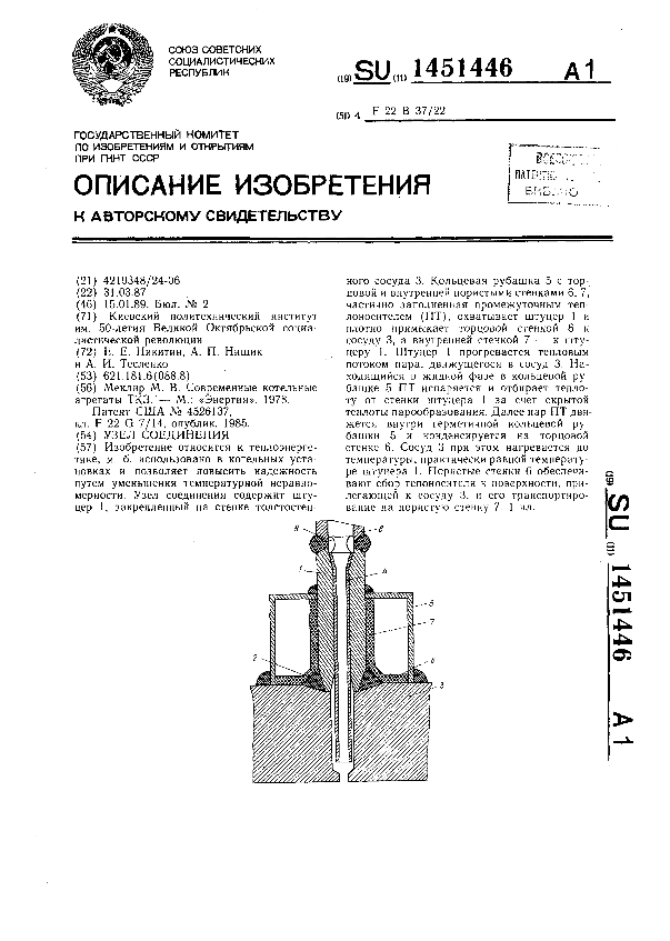 Узел соединения / Никитин Е. Е., Нищик А. П., Тесленко А. И.; заявитель: Киевский политехнический институт им. 50-летия Великой Октябрьской социалистической революции // Описания изобретений (ретрофонд) / Комитет по патентам и товарным знакам России. – М., 2003. – 1989, № 1. — (Патенты России). — Загл. с титул. экрана. — Поисковая система: ИПС MIMOSA GTI. — Систем. требования: Acrobat Reader. — Режим доступа: ftp://smolensklib.ru/bd/patent_ru/pt1451446.pdf. — <URL:ftp://smolensklib.ru/bd/patent_ru/pt1451446.pdf>.