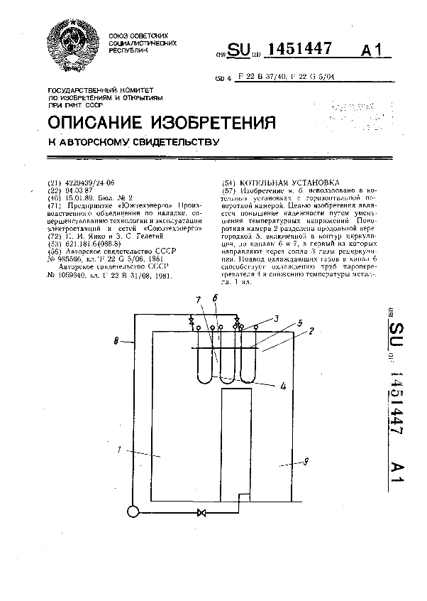 Котельная установка / Янко П. И., Гелетий З. С.; заявитель: Предприятие «Южтехэнерго» Производственного объединения по наладке, совершенствованию технологии и эксплуатации электростанций и сетей «Союзтехэнерго» // Описания изобретений (ретрофонд) / Комитет по патентам и товарным знакам России. – М., 2003. – 1989, № 1. — (Патенты России). — Загл. с титул. экрана. — Поисковая система: ИПС MIMOSA GTI. — Систем. требования: Acrobat Reader. — Режим доступа: ftp://smolensklib.ru/bd/patent_ru/pt1451447.pdf. — <URL:ftp://smolensklib.ru/bd/patent_ru/pt1451447.pdf>.