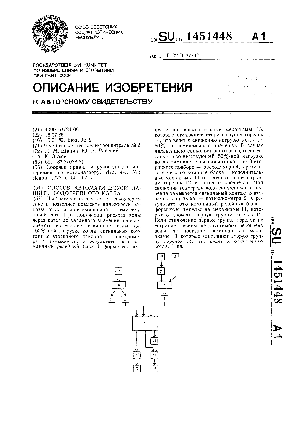 Способ автоматической защиты водогрейного котла / Щапин Н. М., Райский Ю. Б., Зыков А. К.; заявитель: Челябинская теплоэлектроцентраль № 2 // Описания изобретений (ретрофонд) / Комитет по патентам и товарным знакам России. – М., 2003. – 1989, № 1. — (Патенты России). — Загл. с титул. экрана. — Поисковая система: ИПС MIMOSA GTI. — Систем. требования: Acrobat Reader. — Режим доступа: ftp://smolensklib.ru/bd/patent_ru/pt1451448.pdf. — <URL:ftp://smolensklib.ru/bd/patent_ru/pt1451448.pdf>.