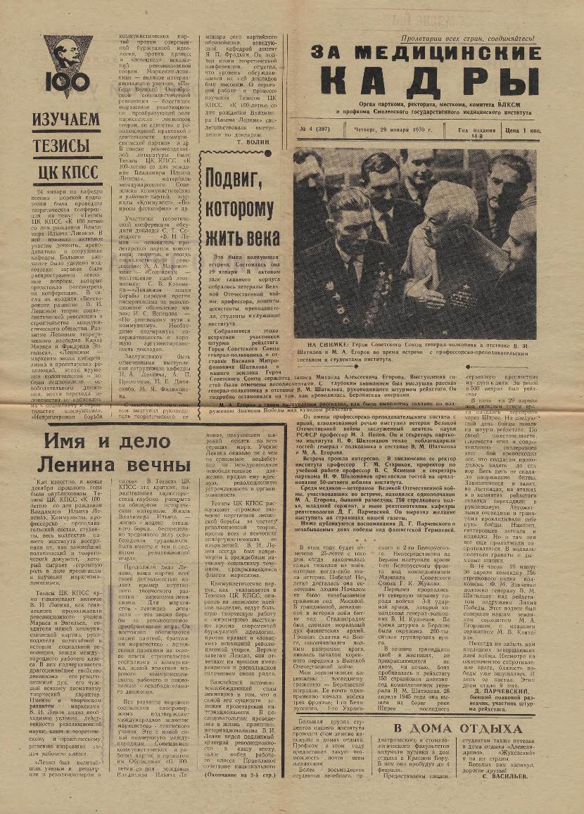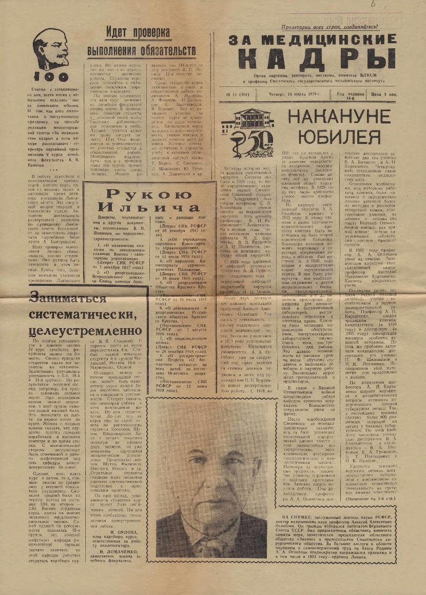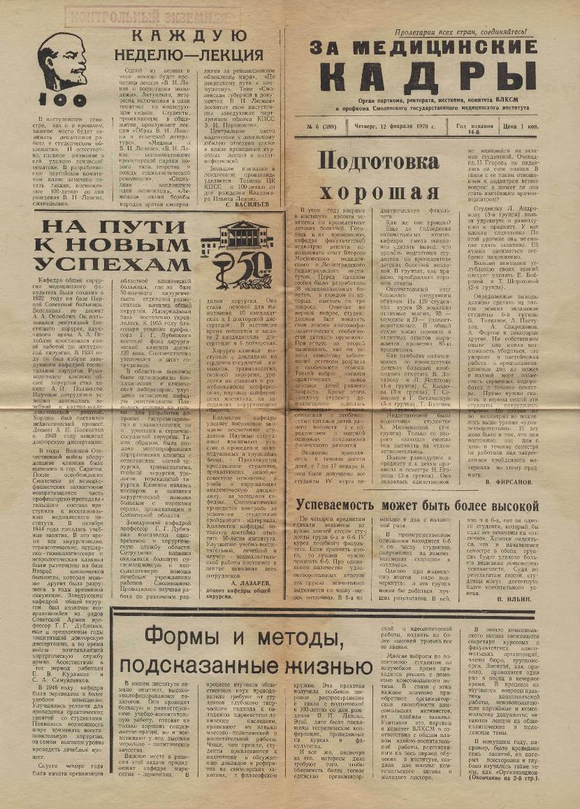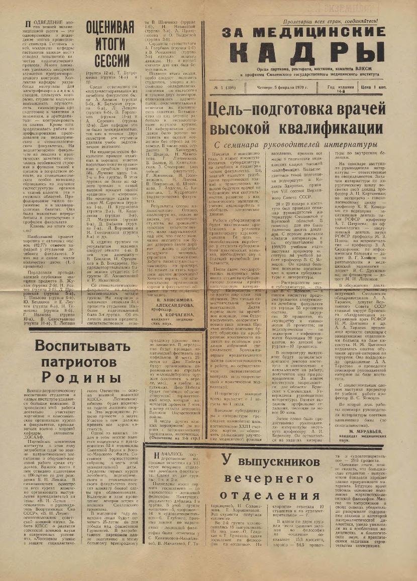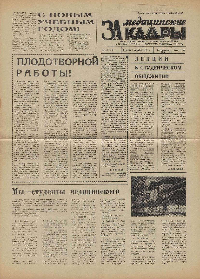 За медицинские кадры: Орган парткома, ректората, месткома, комитета ВЛКСМ и профкома Смоленского государственного медицинского института. — Смоленск: Тип. им. Смирнова, 1957-____. № 26.