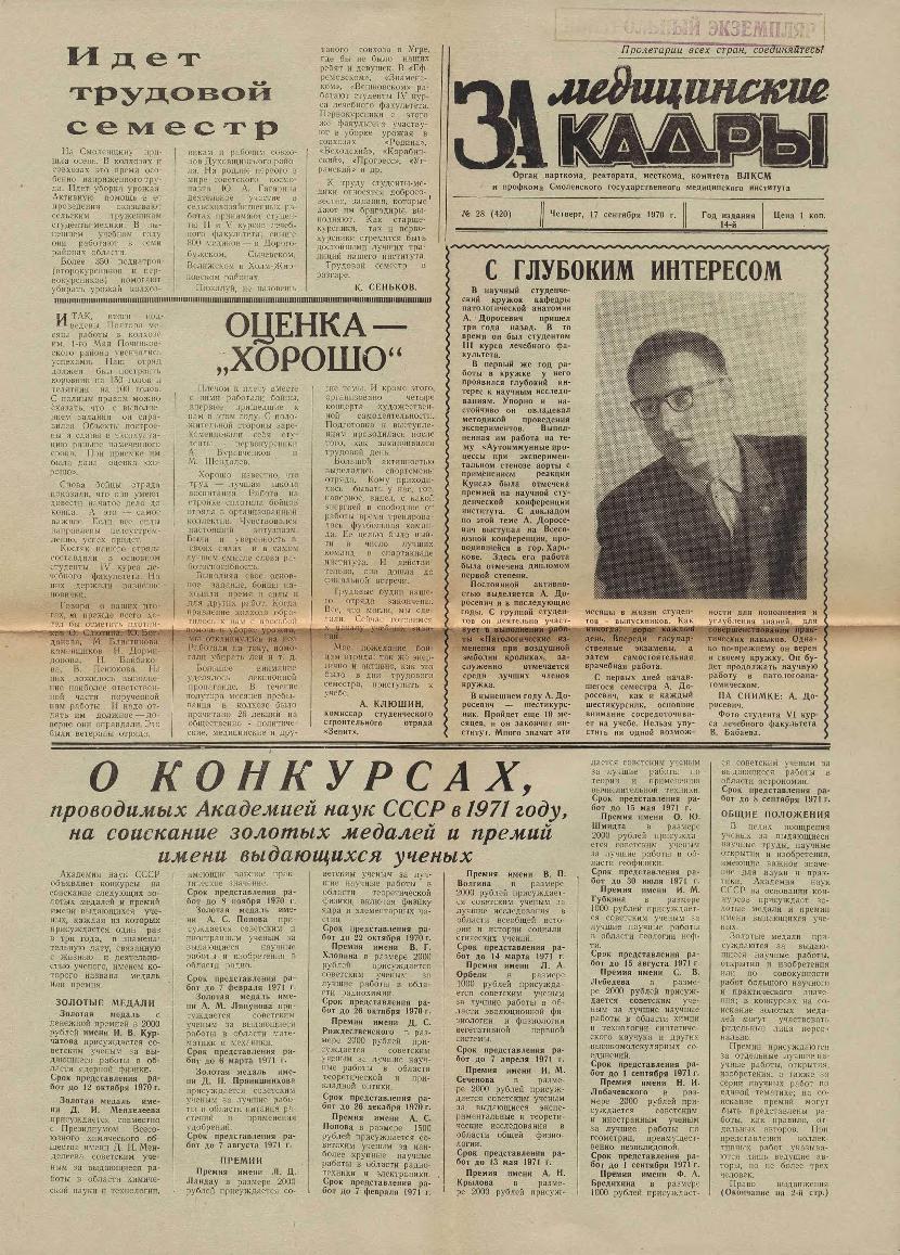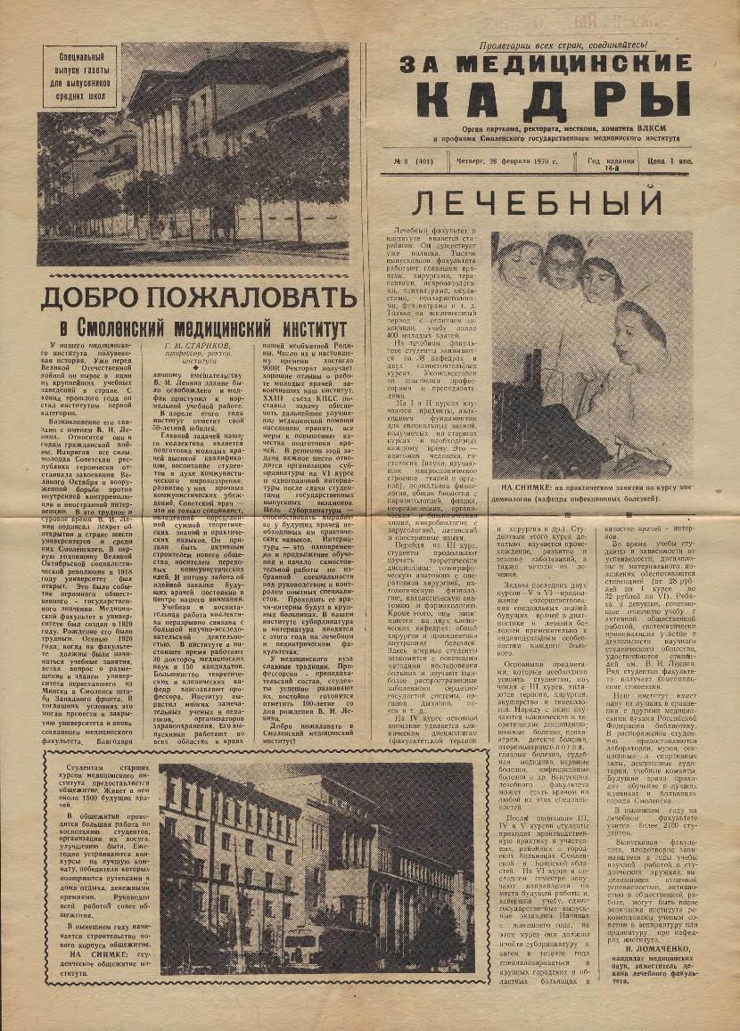 За медицинские кадры: Орган парткома, ректората, месткома, комитета ВЛКСМ и профкома Смоленского государственного медицинского института. — Смоленск: Тип. им. Смирнова, 1957-____. № 28.