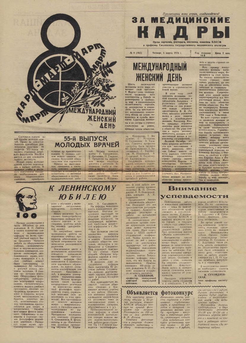 За медицинские кадры: Орган парткома, ректората, месткома, комитета ВЛКСМ и профкома Смоленского государственного медицинского института. — Смоленск: Тип. им. Смирнова, 1957-____. № 9.