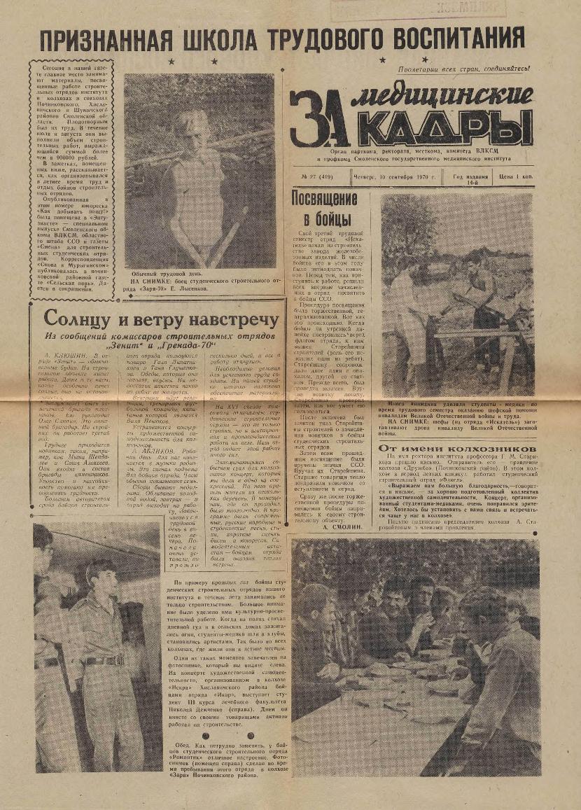 За медицинские кадры: Орган парткома, ректората, месткома, комитета ВЛКСМ и профкома Смоленского государственного медицинского института. — Смоленск: Тип. им. Смирнова, 1957-____. № 27.