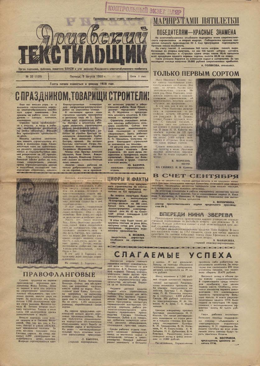 Ярцевский текстильщик: Орган парткома, фабкома, комитета ВЛКСМ и управления Ярцевского хлопчатобумажного комбината. — Ярцево: Ярцевская тип. Смолоблуправления, 1965-____. № 32.