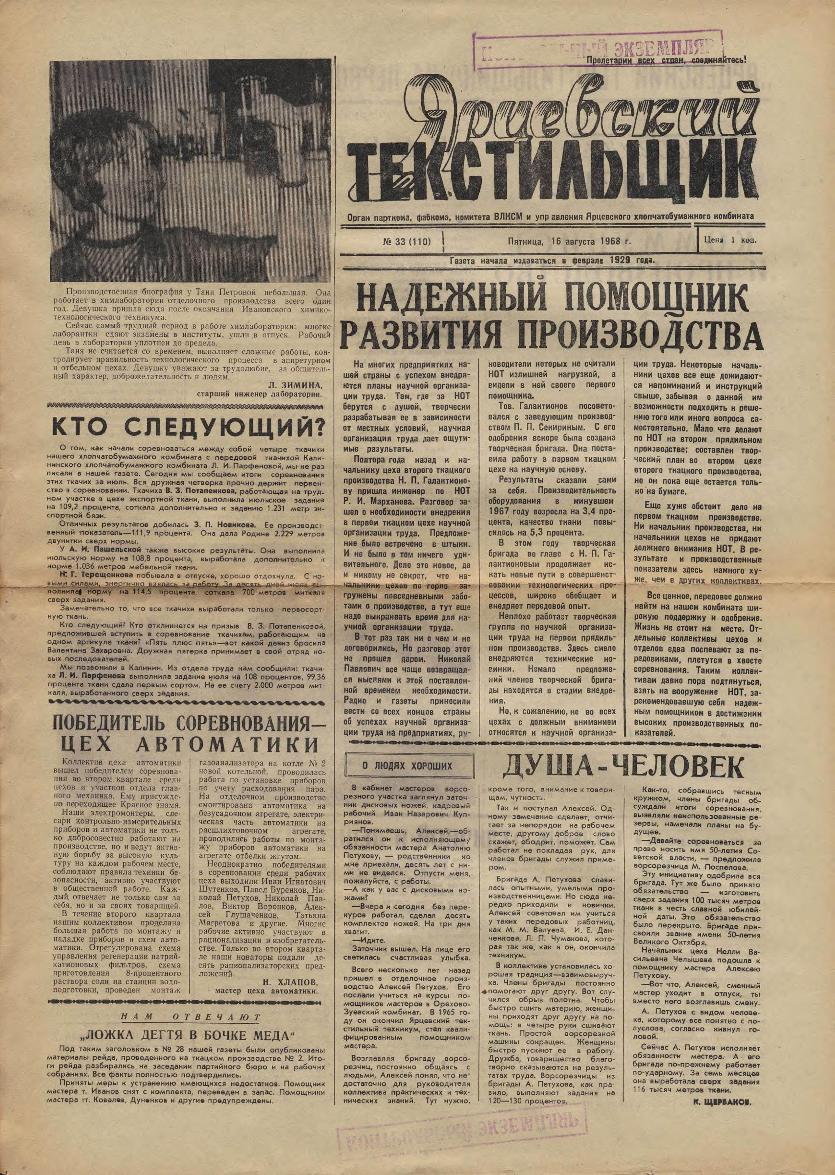 Ярцевский текстильщик: Орган парткома, фабкома, комитета ВЛКСМ и управления Ярцевского хлопчатобумажного комбината. — Ярцево: Ярцевская тип. Смолоблуправления, 1965-____. № 33.
