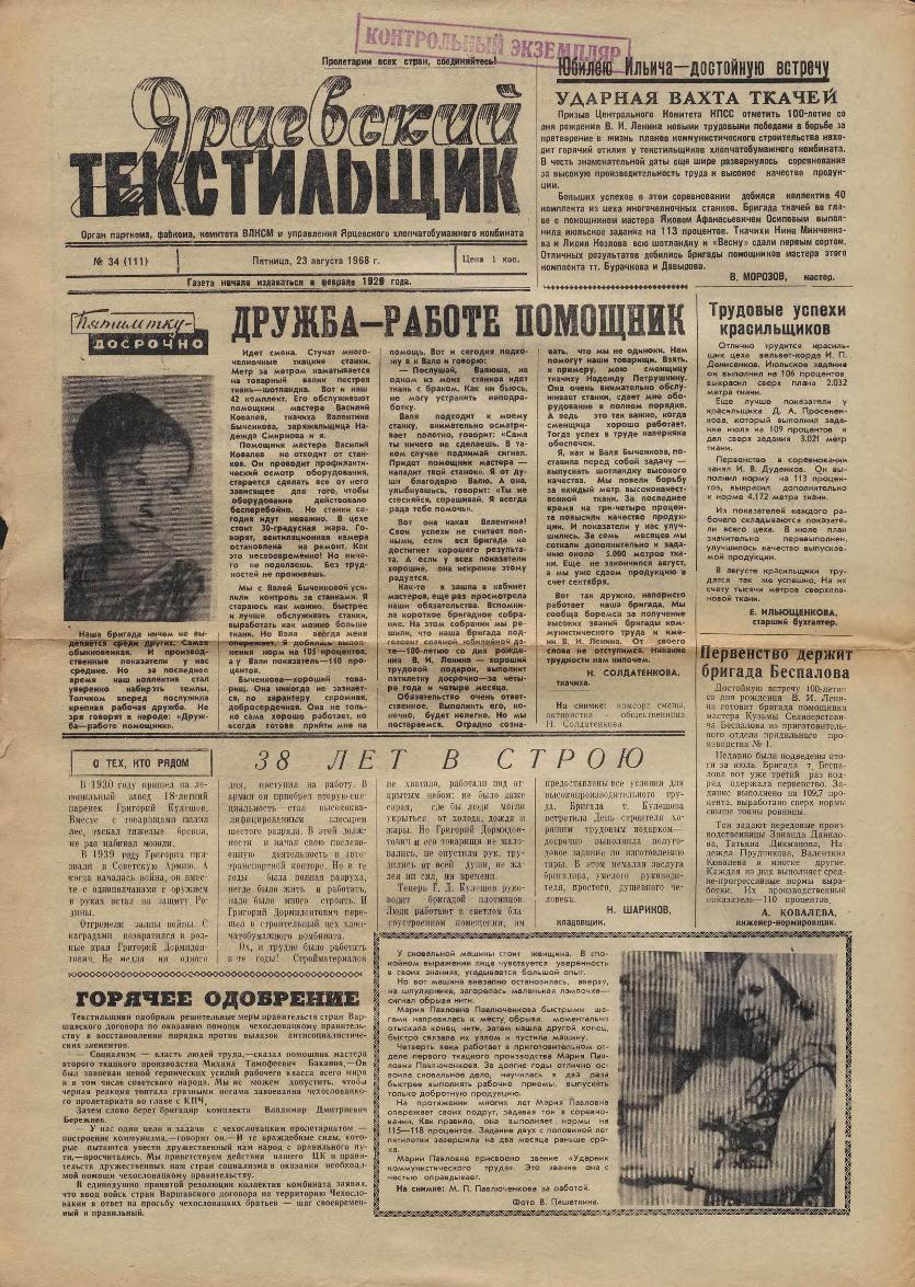 Ярцевский текстильщик: Орган парткома, фабкома, комитета ВЛКСМ и управления Ярцевского хлопчатобумажного комбината. — Ярцево: Ярцевская тип. Смолоблуправления, 1965-____. № 34.