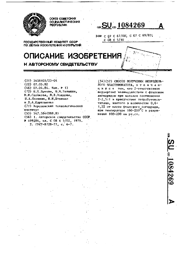 Способ получения непредельного пластификатора / Лычкин И. П., Петыхин Ю. М., Саликова М. И. [и др.]; заявитель : Воронежский технологический институт // Описания изобретений (ретрофонд) / Комитет по патентам и товарным знакам России. – М. — (Патенты России)., 2003. – 1984, № 1. — Загл. с титул. экрана. — Поисковая система: ИПС MIMOSA GTI. — Систем. требования: Acrobat Reader. — Режим доступа: ftp://smolensklib.ru/bd/patent_ru/pt1084269.pdf. — <URL:ftp://smolensklib.ru/bd/patent_ru/pt1084269.pdf>.