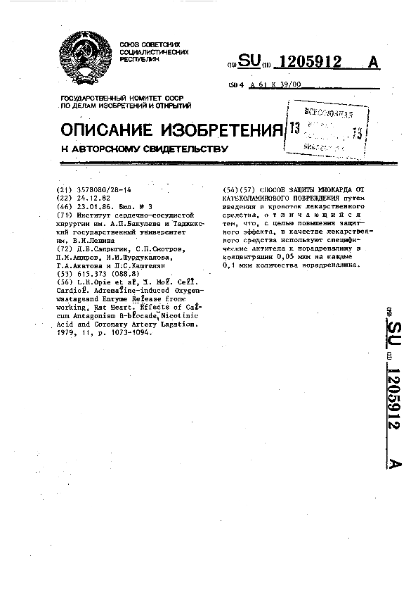 Способ защиты миокарда от катехоламинового повреждения / Сапрыгин Д. Б., Смотров С. П., Аширов П. М. [и др.]; заявитель: Институт сердечно-сосудистой хирургии им. А.П.Бакулева; Таджикский государственный университетим. В. И. Ленина // Описания изобретений (ретрофонд) / Комитет по патентам и товарным знакам России. – М., 2003. – 1986, № 1. — (Патенты России). — Загл. с титул. экрана. — Поисковая система: ИПС MIMOSA GTI. — Систем. требования: Acrobat Reader. — Режим доступа: ftp://smolensklib.ru/bd/patent_ru/pt1205912.pdf. — <URL:ftp://smolensklib.ru/bd/patent_ru/pt1205912.pdf>.