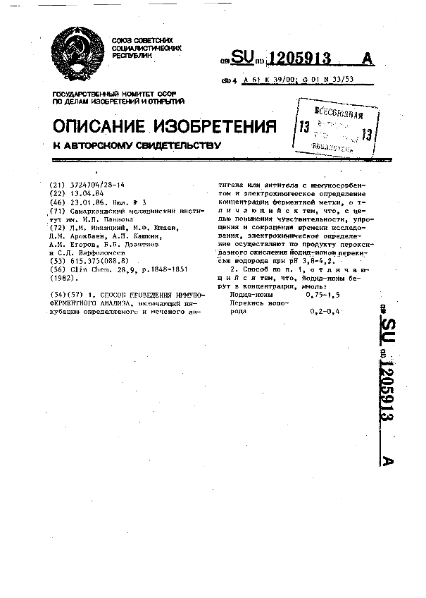 Способ проведения иммуноферментного анализа / Ивницкий Д. М., Юлаев М. Ф., Аронбаев Д. М. [и др.]; заявитель: Самаркандский медицинский институт им. И. П. Павлова // Описания изобретений (ретрофонд) / Комитет по патентам и товарным знакам России. – М., 2003. – 1986, № 1. — (Патенты России). — Загл. с титул. экрана. — Поисковая система: ИПС MIMOSA GTI. — Систем. требования: Acrobat Reader. — Режим доступа: ftp://smolensklib.ru/bd/patent_ru/pt1205913.pdf. — <URL:ftp://smolensklib.ru/bd/patent_ru/pt1205913.pdf>.