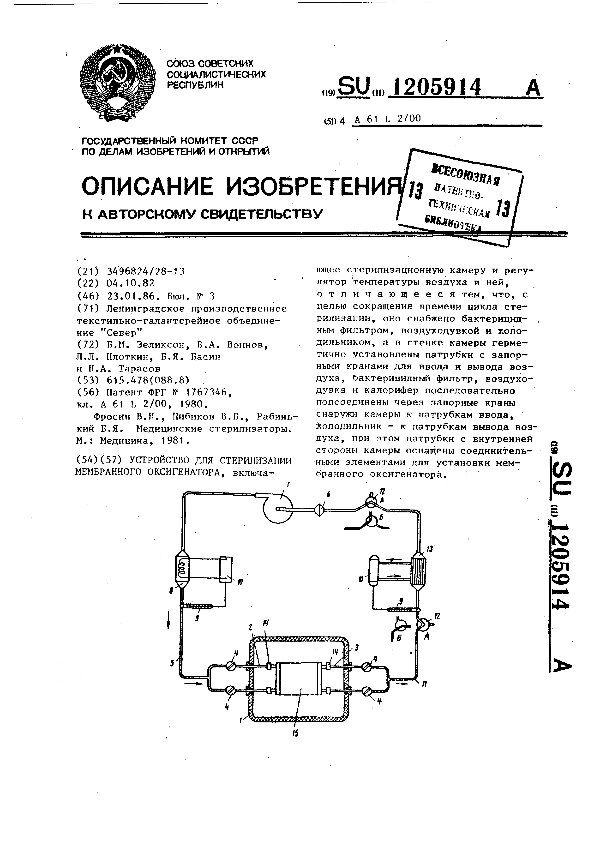 Устройство для стерилизации мембранного оксигенатора / Зеликсон Б. М., Воинов В. А., Плоткин Л. Л. [и др.]; заявитель: Ленинградское производственное текстильно-галантерейное объединение "Север" // Описания изобретений (ретрофонд) / Комитет по патентам и товарным знакам России. – М., 2003. – 1986, № 1. — (Патенты России). — Загл. с титул. экрана. — Поисковая система: ИПС MIMOSA GTI. — Систем. требования: Acrobat Reader. — Режим доступа: ftp://smolensklib.ru/bd/patent_ru/pt1205914.pdf. — <URL:ftp://smolensklib.ru/bd/patent_ru/pt1205914.pdf>.