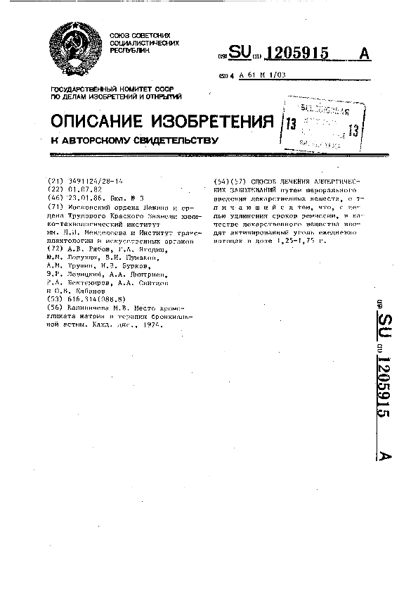 Способ лечения аллергических заболеваний / Рябов А. В., Ягодин Г. А., Лопухин Ю. М. [и др.]; заявитель: Московский ордена Ленина и ордена Трудового Красного Знамени химико-технологический институт им. Д. И. Менделеева; Институт трансплантологии и искусственных органов // Описания изобретений (ретрофонд) / Комитет по патентам и товарным знакам России. – М., 2003. – 1986, № 1. — (Патенты России). — Загл. с титул. экрана. — Поисковая система: ИПС MIMOSA GTI. — Систем. требования: Acrobat Reader. — Режим доступа: ftp://smolensklib.ru/bd/patent_ru/pt1205915.pdf. — <URL:ftp://smolensklib.ru/bd/patent_ru/pt1205915.pdf>.