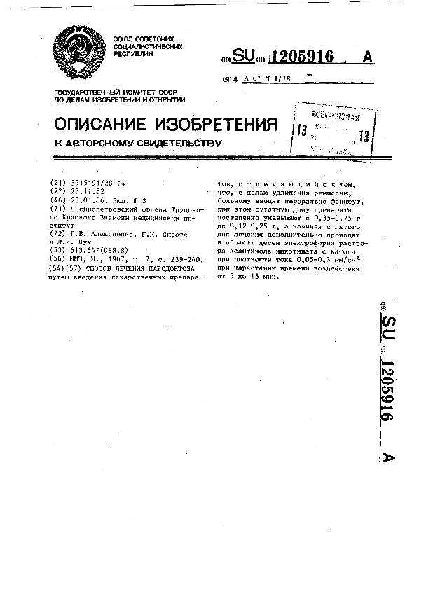 Способ лечения пародонтоза / Алексеенко Г. В., Сирота Г. И., Жук Л. И.; заявитель: Днепропетровский ордена Трудового Красного Знамени медицинский институт // Описания изобретений (ретрофонд) / Комитет по патентам и товарным знакам России. – М., 2003. – 1986, № 1. — (Патенты России). — Загл. с титул. экрана. — Поисковая система: ИПС MIMOSA GTI. — Систем. требования: Acrobat Reader. — Режим доступа: ftp://smolensklib.ru/bd/patent_ru/pt1205916.pdf. — <URL:ftp://smolensklib.ru/bd/patent_ru/pt1205916.pdf>.