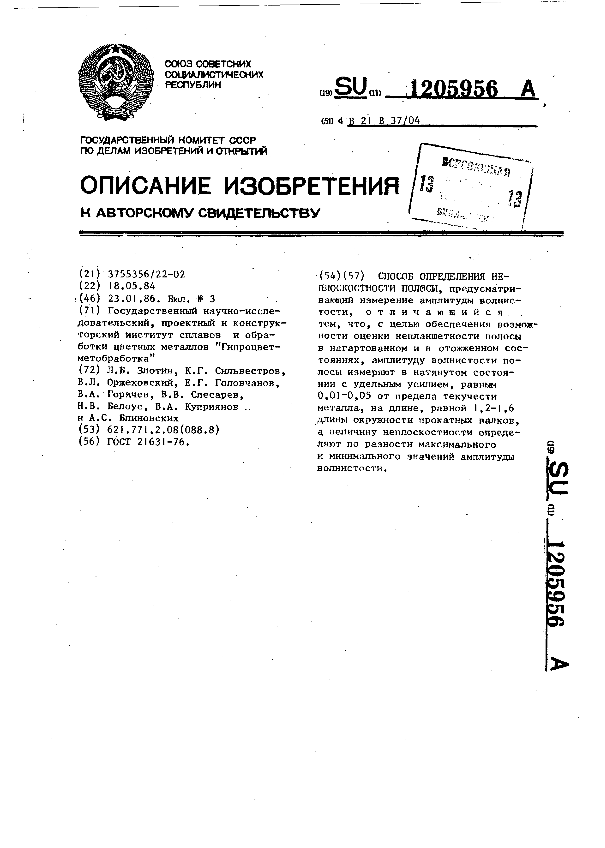 Способ определения неплоскостности полосы / Злотин Л. Б., Сильвестров К. Г., Оржеховский В. Л. [и др.; заявитель: Государственный научно-исследовательский, проектный и конструкторский институт сплавов и обработки цветных металлов "Гипроцветметобработка" // Описания изобретений (ретрофонд) / Комитет по патентам и товарным знакам России. – М., 2003. – 1986, № 1. — (Патенты России). — Загл. с титул. экрана. — Поисковая система: ИПС MIMOSA GTI. — Систем. требования: Acrobat Reader. — Режим доступа: ftp://smolensklib.ru/bd/patent_ru/pt1205956.pdf. — <URL:ftp://smolensklib.ru/bd/patent_ru/pt1205956.pdf>.