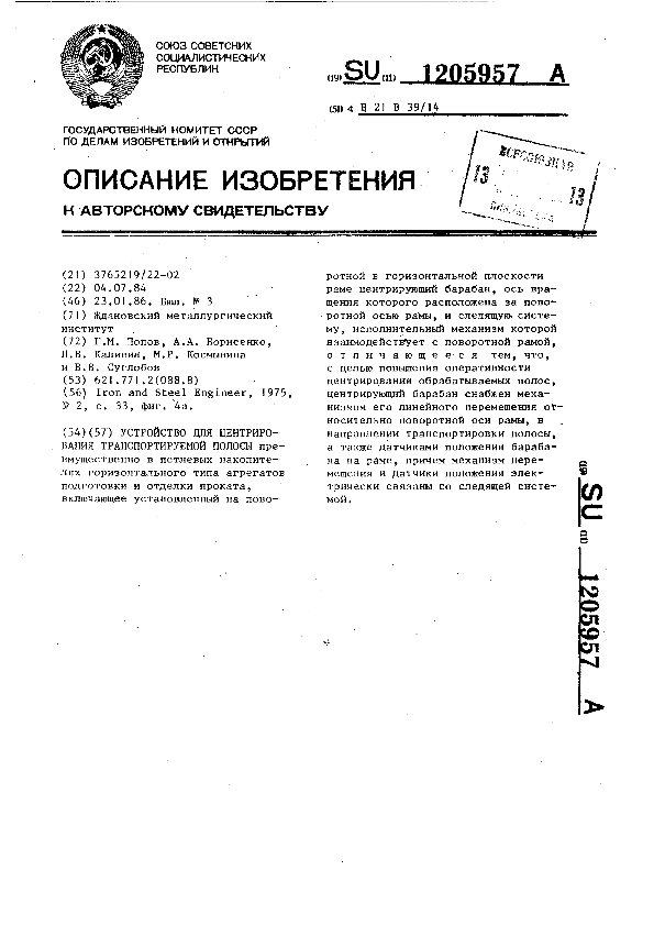 Устройство для центрирования транспортируемой полосы / Попов Г. М., Борисенко А. А., Калинин Л. В. [и др].; заявитель: Ждановский металлургический институт // Описания изобретений (ретрофонд) / Комитет по патентам и товарным знакам России. – М., 2003. – 1986, № 1. — (Патенты России). — Загл. с титул. экрана. — Поисковая система: ИПС MIMOSA GTI. — Систем. требования: Acrobat Reader. — Режим доступа: ftp://smolensklib.ru/bd/patent_ru/pt1205957.pdf. — <URL:ftp://smolensklib.ru/bd/patent_ru/pt1205957.pdf>.