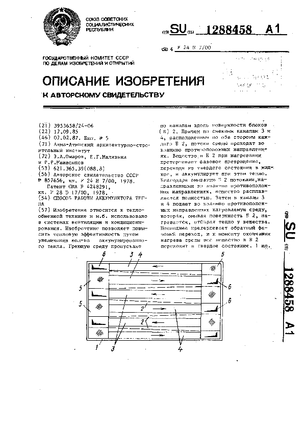 Способ работы аккумулятора тепла / Омаров Э. А., Малявина Е. Г., Манасыпов Р. Р.; заявитель: Алма-Атинский архитектурно-строительный институт // Описания изобретений (ретрофонд) / Комитет по патентам и товарным знакам России. – М., 2003. – 1987, № 1. — (Патенты России). — Загл. с титул. экрана. — Поисковая система: MIMOSA GTI. — Систем. требования: Acrobat Reader. — Режим доступа: ftp://smolensklib.ru/bd/patent_ru/pt1288458.pdf. — <URL:ftp://smolensklib.ru/bd/patent_ru/pt1288458.pdf>.
