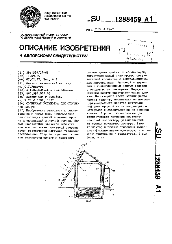Солнечная установка для отопления здания / Ширинский А. Ф., Кабилов З. А.; заявитель: Физико-технический институт им. С. У. Умарова // Описания изобретений (ретрофонд) / Комитет по патентам и товарным знакам России. – М., 2003. – 1987, № 1. — (Патенты России). — Загл. с титул. экрана. — Поисковая система: MIMOSA GTI. — Систем. требования: Acrobat Reader. — Режим доступа: ftp://smolensklib.ru/bd/patent_ru/pt1288459.pdf. — <URL:ftp://smolensklib.ru/bd/patent_ru/pt1288459.pdf>.