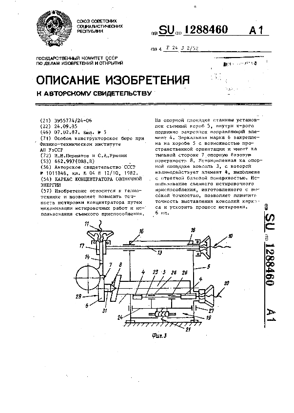 Каркас концентратора солнечной энергии / Пирматов И. И., Урюпин С. А.; заявитель: Особое конструкторское бюро при Физико-техническом институте АН УзССР // Описания изобретений (ретрофонд) / Комитет по патентам и товарным знакам России. – М., 2003. – 1987, № 1. — (Патенты России). — Загл. с титул. экрана. — Поисковая система: MIMOSA GTI. — Систем. требования: Acrobat Reader. — Режим доступа: ftp://smolensklib.ru/bd/patent_ru/pt1288460.pdf. — <URL:ftp://smolensklib.ru/bd/patent_ru/pt1288460.pdf>.