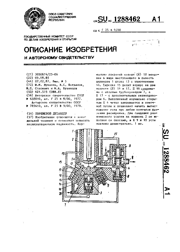 Поршневой детандер / Духанин Ю. И., Богданов В. С., Стасевич Н. П., Кузнецов М. А. // Описания изобретений (ретрофонд) / Комитет по патентам и товарным знакам России. – М., 2003. – 1987, № 1. — (Патенты России). — Загл. с титул. экрана. — Поисковая система: MIMOSA GTI. — Систем. требования: Acrobat Reader. — Режим доступа: ftp://smolensklib.ru/bd/patent_ru/pt1288462.pdf. — <URL:ftp://smolensklib.ru/bd/patent_ru/pt1288462.pdf>.
