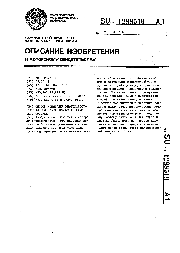 Способ испытания многополостных изделий, разделенных тонкими перегородками / Болотин В. Н. // Описания изобретений (ретрофонд) / Комитет по патентам и товарным знакам России. – М., 2003. – 1987, № 1. — (Патенты России). — Загл. с титул. экрана. — Поисковая система: MIMOSA GTI. — Систем. требования: Acrobat Reader. — Режим доступа: ftp://smolensklib.ru/bd/patent_ru/pt1288519.pdf. — <URL:ftp://smolensklib.ru/bd/patent_ru/pt1288519.pdf>.