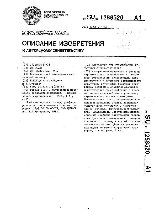 Устройство для механических испытаний стеновых панелей / Горин Н. И., Жарков А. Ф., Фролов И. Н.; заявитель: Волгоградский инженерно-строительный институт // Описания изобретений (ретрофонд) / Комитет по патентам и товарным знакам России. – М., 2003. – 1987, № 1. — (Патенты России). — Загл. с титул. экрана. — Поисковая система: MIMOSA GTI. — Систем. требования: Acrobat Reader. — Режим доступа: ftp://smolensklib.ru/bd/patent_ru/pt1288520.pdf. — <URL:ftp://smolensklib.ru/bd/patent_ru/pt1288520.pdf>.