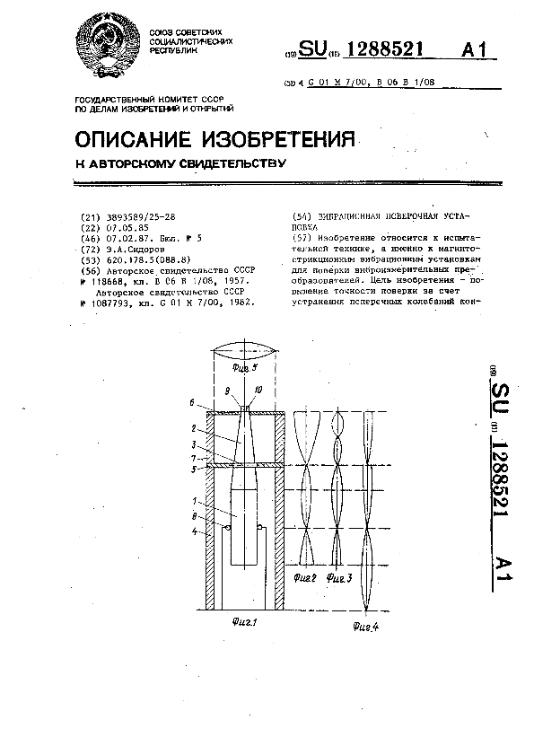 Вибрационная поверочная установка / Сидоров Э. А. // Описания изобретений (ретрофонд) / Комитет по патентам и товарным знакам России. – М., 2003. – 1987, № 1. — (Патенты России). — Загл. с титул. экрана. — Поисковая система: MIMOSA GTI. — Систем. требования: Acrobat Reader. — Режим доступа: ftp://smolensklib.ru/bd/patent_ru/pt1288521.pdf. — <URL:ftp://smolensklib.ru/bd/patent_ru/pt1288521.pdf>.
