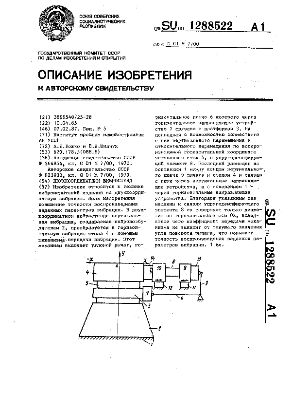 Двухкоординатный вибростенд / Божко А. Е., Шпачук В. П.; заявитель: Институт проблем машиностроения АН УССР // Описания изобретений (ретрофонд) / Комитет по патентам и товарным знакам России. – М., 2003. – 1987, № 1. — (Патенты России). — Загл. с титул. экрана. — Поисковая система: MIMOSA GTI. — Систем. требования: Acrobat Reader. — Режим доступа: ftp://smolensklib.ru/bd/patent_ru/pt1288522.pdf. — <URL:ftp://smolensklib.ru/bd/patent_ru/pt1288522.pdf>.