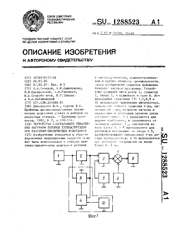 Устройство программного управления нагревом роторов турбоагрегатов при разгонно-циклических испытаниях / Базаров А. А., Данилушкин А. И., Макаровский Л. Я. [и др.] // Описания изобретений (ретрофонд) / Комитет по патентам и товарным знакам России. – М., 2003. – 1987, № 1. — (Патенты России). — Загл. с титул. экрана. — Поисковая система: MIMOSA GTI. — Систем. требования: Acrobat Reader. — Режим доступа: ftp://smolensklib.ru/bd/patent_ru/pt1288523.pdf. — <URL:ftp://smolensklib.ru/bd/patent_ru/pt1288523.pdf>.