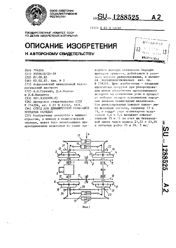 Стенд для динамических испытаний зубчатых передач / Гуревич А. И., Каплан Д. А., Михрютин В. В.; заявитель: Андроповский авиационный технологический институт // Описания изобретений (ретрофонд) / Комитет по патентам и товарным знакам России. – М., 2003. – 1987, № 1. — (Патенты России). — Загл. с титул. экрана. — Поисковая система: MIMOSA GTI. — Систем. требования: Acrobat Reader. — Режим доступа: ftp://smolensklib.ru/bd/patent_ru/pt1288525.pdf. — <URL:ftp://smolensklib.ru/bd/patent_ru/pt1288525.pdf>.
