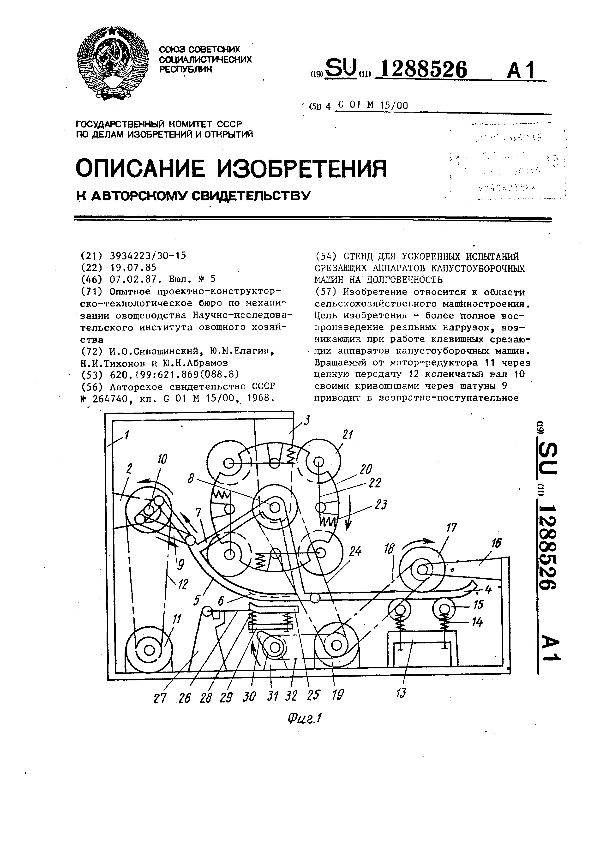 Стенд для ускоренных испытаний срезающих аппаратов капустоуборочных машин на долговечность / Сивашинский И. И., Елагин Ю. М., Тихонов Н. И., Абрамов Ю. Н.; заявитель: Опытное проектно-конструкторско-технологическое бюро по механизации овощеводства Научно-исследовательского института овощного хозяйства // Описания изобретений (ретрофонд) / Комитет по патентам и товарным знакам России. – М., 2003. – 1987, № 1. — (Патенты России). — Загл. с титул. экрана. — Поисковая система: MIMOSA GTI. — Систем. требования: Acrobat Reader. — Режим доступа: ftp://smolensklib.ru/bd/patent_ru/pt1288526.pdf. — <URL:ftp://smolensklib.ru/bd/patent_ru/pt1288526.pdf>.