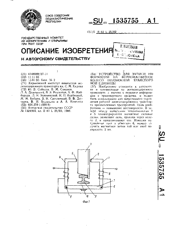 Устройство для записи информации на ферромагнитное колесо подвижной транспортной единицы / Соболев Ю. В., Соколов В. М., Домницкий Л. А. [и др.]; заявитель: Харьковский институт инженеров железнодорожноготранспорта им. С. М. Кирова // Описания изобретений (ретрофонд) / Комитет по патентам и товарным знакам России. – М., 2003. – 1990, № 1. — (Патенты России). — Загл. с титул. экрана. — Поисковая система: MIMOSA GTI. — Систем. требования: Acrobat Reader. — Режим доступа: ftp://smolensklib.ru/bd/patent_ru/pt1535755.pdf. — <URL:ftp://smolensklib.ru/bd/patent_ru/pt1535755.pdf>.