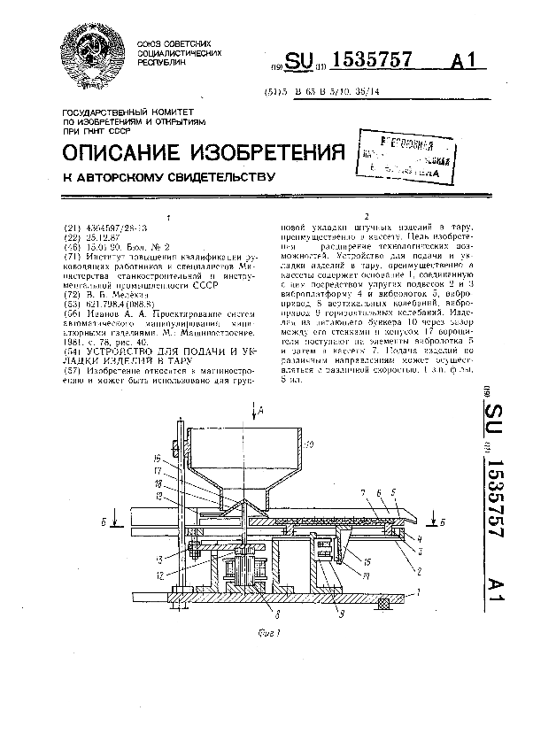Устройство для подачи и укладки изделий в тару / Мелёхин В. Б.; заявитель: Институт повышения квалификации руководящих работников и специалистов Министерства станкостроительной и инструментальной промышленности СССР // Описания изобретений (ретрофонд) / Комитет по патентам и товарным знакам России. – М., 2003. – 1990, № 1. — (Патенты России). — Загл. с титул. экрана. — Поисковая система: MIMOSA GTI. — Систем. требования: Acrobat Reader. — Режим доступа: ftp://smolensklib.ru/bd/patent_ru/pt1535757.pdf. — <URL:ftp://smolensklib.ru/bd/patent_ru/pt1535757.pdf>.