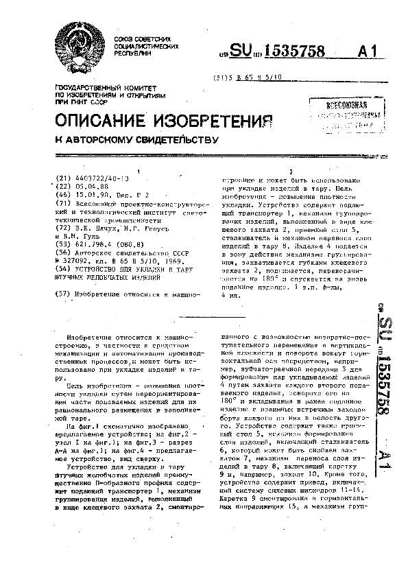 Устройство для укладки в тару штучных желобчатых изделий / Дячун В. К., Гевусь Н. Г., Гуль В. Н.; заявитель: Всесоюзный проектно-конструкторский и технологический институт светотехнической промышленности // Описания изобретений (ретрофонд) / Комитет по патентам и товарным знакам России. – М., 2003. – 1990, № 1. — (Патенты России). — Загл. с титул. экрана. — Поисковая система: MIMOSA GTI. — Систем. требования: Acrobat Reader. — Режим доступа: ftp://smolensklib.ru/bd/patent_ru/pt1535758.pdf. — <URL:ftp://smolensklib.ru/bd/patent_ru/pt1535758.pdf>.