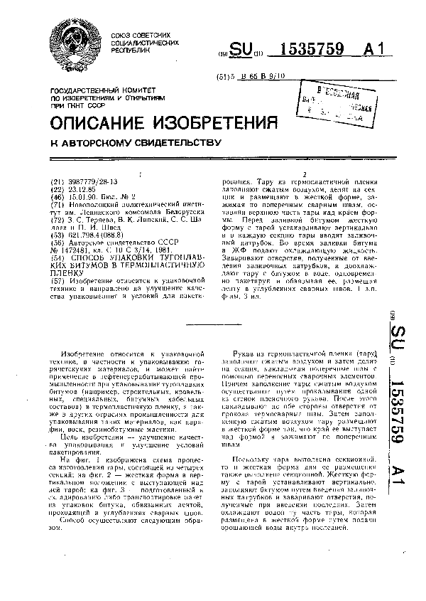 Способ упаковки тугоплавких битумов в термопластичную пленку / Теряева З. С., Липский В. К., Шалаев С. С., Швед П. И.; заявитель: Новополоцкий политехнический институт им. Ленинского комсомола Белоруссии // Описания изобретений (ретрофонд) / Комитет по патентам и товарным знакам России. – М., 2003. – 1990, № 1. — (Патенты России). — Загл. с титул. экрана. — Поисковая система: MIMOSA GTI. — Систем. требования: Acrobat Reader. — Режим доступа: ftp://smolensklib.ru/bd/patent_ru/pt1535759.pdf. — <URL:ftp://smolensklib.ru/bd/patent_ru/pt1535759.pdf>.