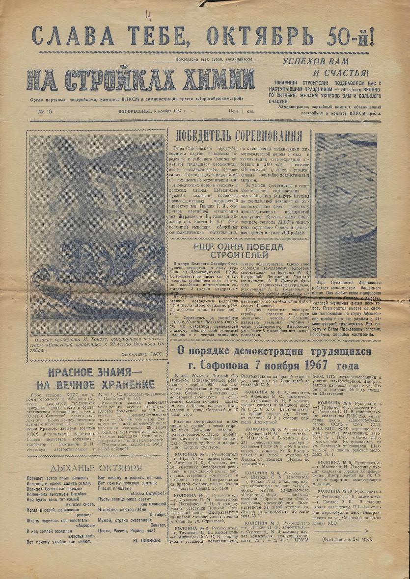 На стройках химии: Орган парткома, постройкома, комитета ВЛКСМ и администрации треста "Дорогобужхимстрой". — Сафоново: Сафоновская тип., 1967-____. № 16.