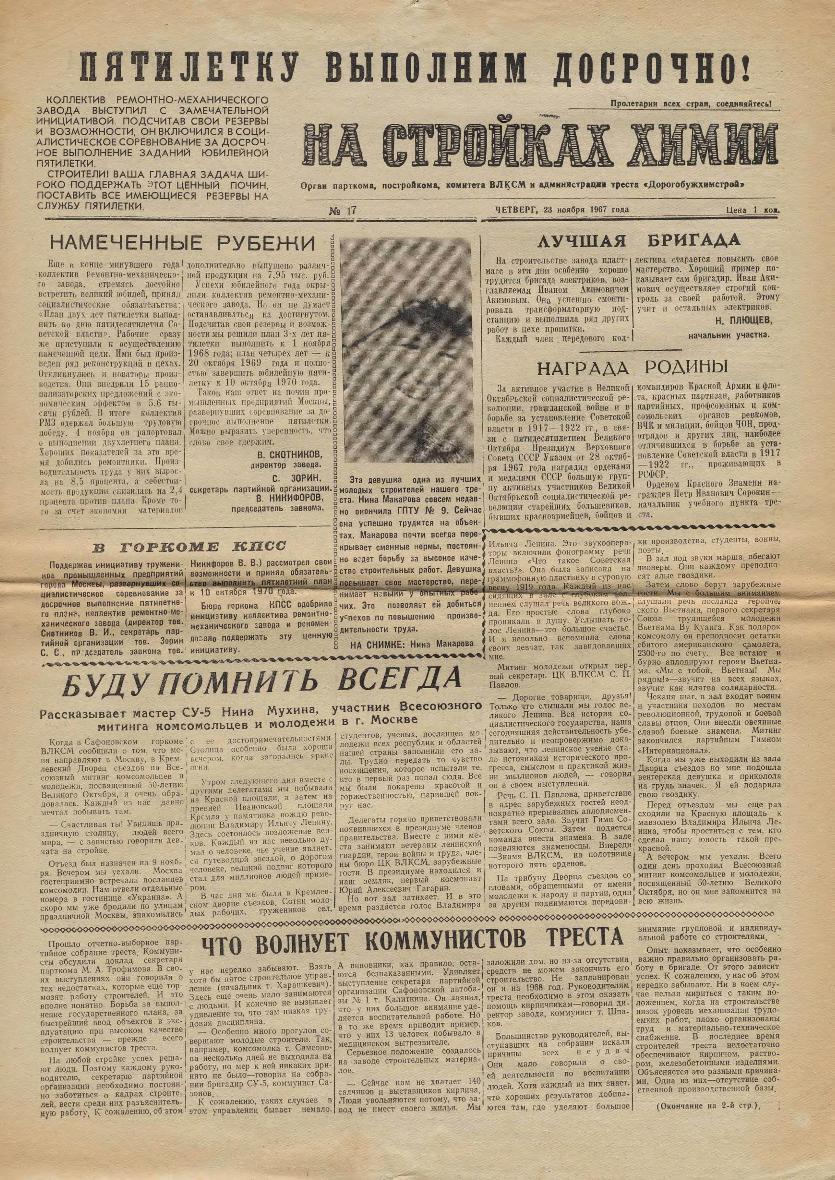 На стройках химии: Орган парткома, постройкома, комитета ВЛКСМ и администрации треста "Дорогобужхимстрой". — Сафоново: Сафоновская тип., 1967-____. № 17.