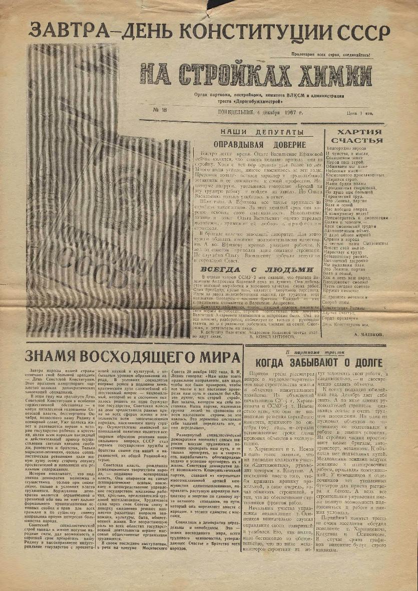 На стройках химии: Орган парткома, постройкома, комитета ВЛКСМ и администрации треста "Дорогобужхимстрой". — Сафоново: Сафоновская тип., 1967-____. № 18.