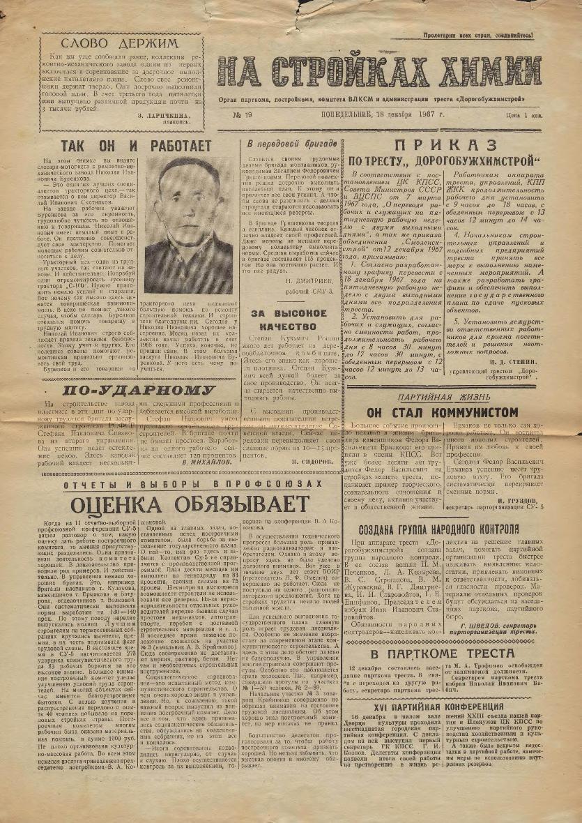 На стройках химии: Орган парткома, постройкома, комитета ВЛКСМ и администрации треста "Дорогобужхимстрой". — Сафоново: Сафоновская тип., 1967-____. № 19.