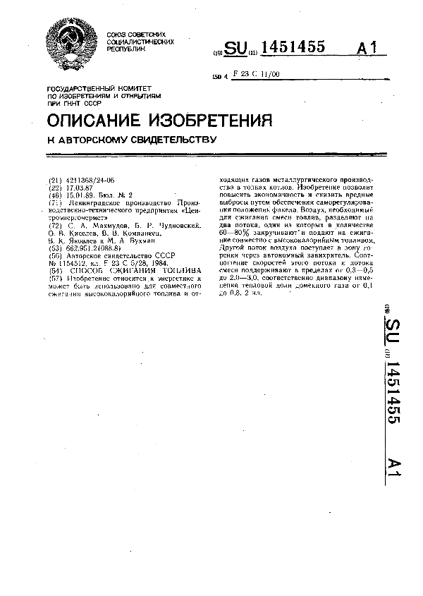 Способ сжигания топлива / Махмудов С. А., Чудновский Б. Р., Киселев О. В. [и др.]; заявитель: Ленинградское производство Производственно-технического предприятия «Центроэнергочермет» // Описания изобретений (ретрофонд) / Комитет по патентам и товарным знакам России. – М., 2003. – 1989, № 1. — (Патенты России). — Загл. с титул. экрана. — Поисковая система: ИПС MIMOSA GTI. — Систем. требования: Acrobat Reader. — Режим доступа: ftp://smolensklib.ru/bd/patent_ru/pt1451455.pdf. — <URL:ftp://smolensklib.ru/bd/patent_ru/pt1451455.pdf>.