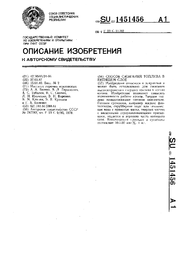 Способ сжигания топлива в кипящем слое / Беляев А. А., Гершкович В. Л., Тоболин А. С. [и др.]; заявитель: Институт горючих ископаемых // Описания изобретений (ретрофонд) / Комитет по патентам и товарным знакам России. – М., 2003. – 1989, № 1. — (Патенты России). — Загл. с титул. экрана. — Поисковая система: ИПС MIMOSA GTI. — Систем. требования: Acrobat Reader. — Режим доступа: ftp://smolensklib.ru/bd/patent_ru/pt1451456.pdf. — <URL:ftp://smolensklib.ru/bd/patent_ru/pt1451456.pdf>.